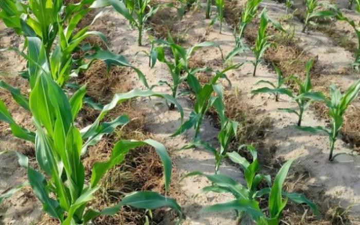 玉米雌小花分化、吐丝及籽粒形成始于雌穗中下部,向上或向下同时进行,顶部最后结束。环境条件不适时,顶部小花或受精胚因养分不足易败育。秃尖成因包括:①顶部小花分化期遇干旱或肥力不足退化为不育花;②抽雄前高温干旱导致散粉提前或顶部花丝抽出过晚错过授粉;③密植、缺肥、干旱、雹灾或连阴雨使光合作用减弱,顶部受精胚发育受阻。玉米花粒由授粉期干旱、高温等导致雌雄花期不遇或阴雨影响授粉所致。授粉不良、品种特性、栽培管理及气候条件(如高温、干旱、阴雨)均会影响籽粒发育。