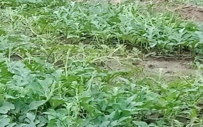西瓜疫病主要危害茎、叶和果实,苗期和成株期均可染病。茎染病多在蔓茎基部及嫩茎节部发生,初始产生暗绿色水渍状斑,扩大后病斑绕茎蔓一周,病部明显缢缩,变细软化,造成病部以上枝叶逐渐枯萎。叶片染病初始在叶边缘和叶柄连接处产生水渍状斑,扩大后成圆形或不规则形的暗绿色大斑,边缘不明显,潮湿时病斑发展迅速,病叶腐烂,干燥时病斑干枯易破裂。果实染病,病部出现暗绿色水浸状凹陷斑,后迅速扩至全果,使果实腐烂,并发出腥臭味,潮湿条件下病部表面长出稀疏的灰白色霉层,即病菌的孢囊梗和孢子囊。幼苗染病先呈水浸状暗绿色圆形斑,中央逐渐变成红褐色,近地面处缢缩或枯死。真叶染病初生暗绿色水浸状圆形或不整形病斑,迅速扩展,湿度大时腐烂或像开水烫过,干后为淡褐色,易破碎。茎基部染病生纺锤形水浸状暗绿色凹陷斑,包围茎部且腐烂,患部以上全部枯死。果实染病形成暗绿色圆形水浸状凹陷斑,后迅速扩及全果,致果实腐烂。